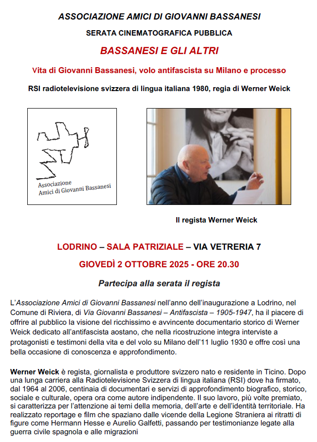 Lodrino, Sala patriziale, 2.10.2025, proiezione del documentario Bassanesi e gli altri, RSI 1980, regia di Werner Weick, con partecipazione del regista alla serata